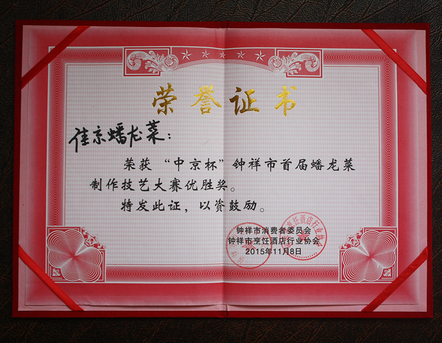 佳京蟠龍菜榮獲中京杯證書